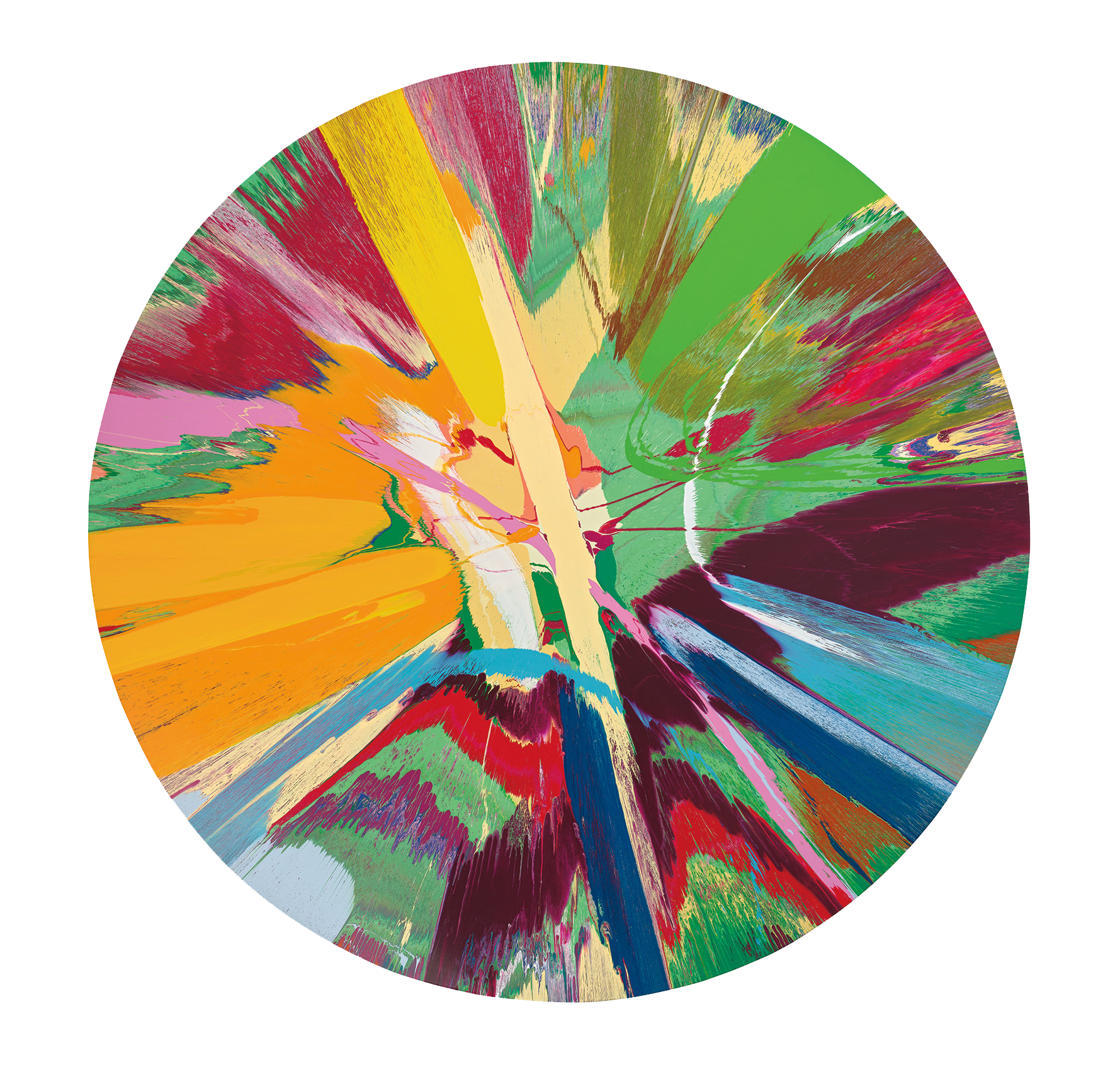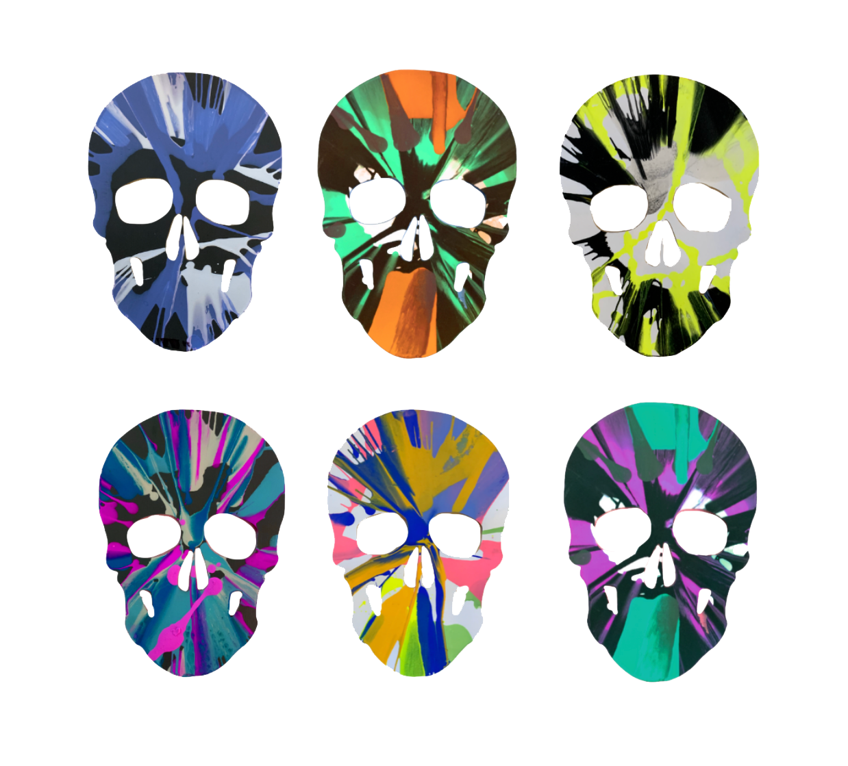 Enter here for a kinetic meditation on color, repetition, and the enduring skull — spun, splashed, and set into perpetual motion.